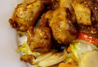 The seemingly eclectic mix of ingredients that form the marinade amalgamate into an eyebrow raisingly tasty sauce. Additionally, the liver pate doesn't remain as a separate flavour, but instead forms a thickener that delivers an interesting amount of Umami to the overall flavour. I have one word of warning though, which is to not panic when you realise just how intensely sweet the whole recipe has become. I was so glad that I'd used white wine vinegar instead of the balsamic that had been my first choice. (The type of vinegar isn't given, on the recipe, you see). I reckon that balsamic would have tipped it over the edge into unbearably sweet. However, with the plain white Basmati rice and the plain stir fried veggies (which I did with a little olive oil - and nothing else) they went perfectly with the intense, sweet sauce of the chicken and balanced the whole dish. Don't be tempted to put anything even remotely sweet with it as a side dish!